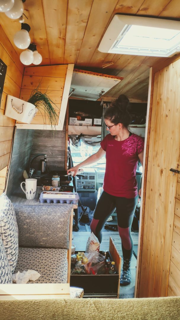 Většinou ráno vstaneme, asi jako všichni. Úplně nám nejde vstávat moc brzo, když člověk nemá přesnou rutinu, tak se prostě dobrovolně z té postele hrabe těžko. Navíc máme v dodávce po ránu největší zimu a často si musíme přitopit, abychom vůbec nějak vylezli.