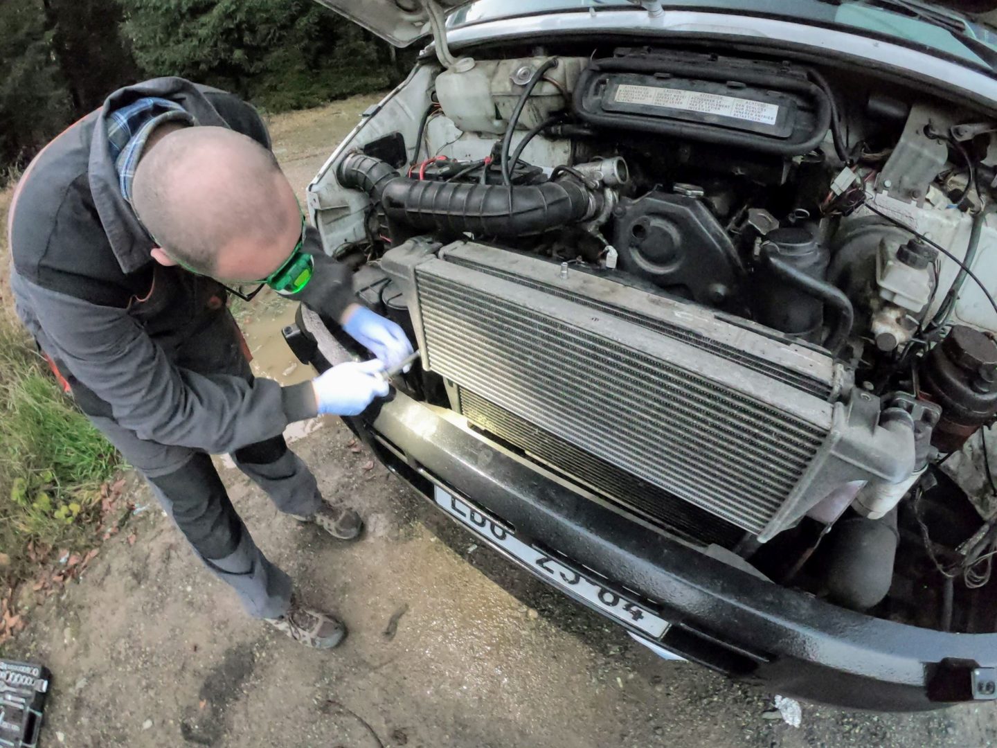 Jedeme tak dál, šineme se to do kopce a když už přejíždíme sedlo v asi 1050m a vypadá to, že už to bude jen dolů z kopce, tak auto začne vydávat zas jiný zvuky. Leo tedy zastavuje a jde se na to kouknout. Zjišťuje, že nám teče voda z chladiče. Dnes jsme dojeli. A vypadá to na dlouho. Po rozebrání se ukazuje, že máme celkem velkou díru v chladiči. To není dobrý. Co s tím? Venku už je tma, my někde na kopci, kolem nás jen psi. Tak to jdeme opravit. Je potřeba nějak zadělat tu díru. Jako nejlepší se nám zdá taková hmota, co si s sebou vezeme pro tyto případy. Vypadá to jako modelína, má dvě části a když je správně promícháte, tak to pak zatuhne. A vydrží to opravdu hodně! Tak jsme zalepovali s nechali to přes noc schnout.