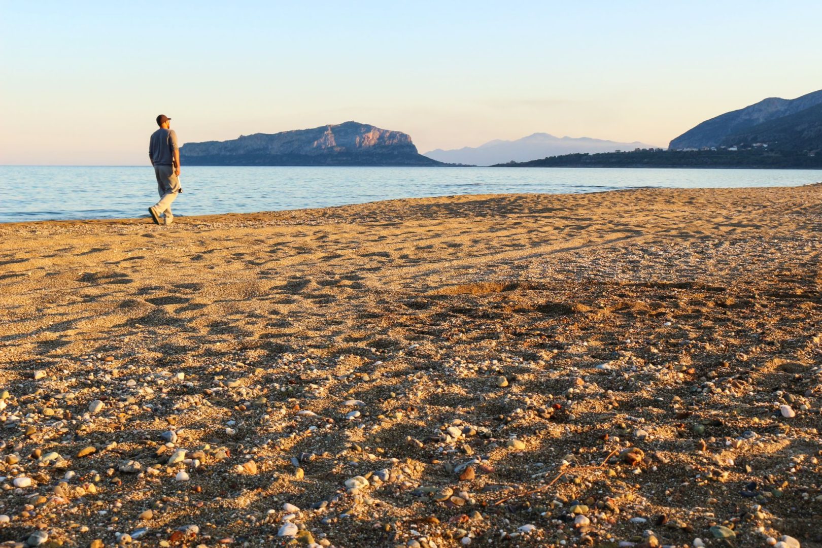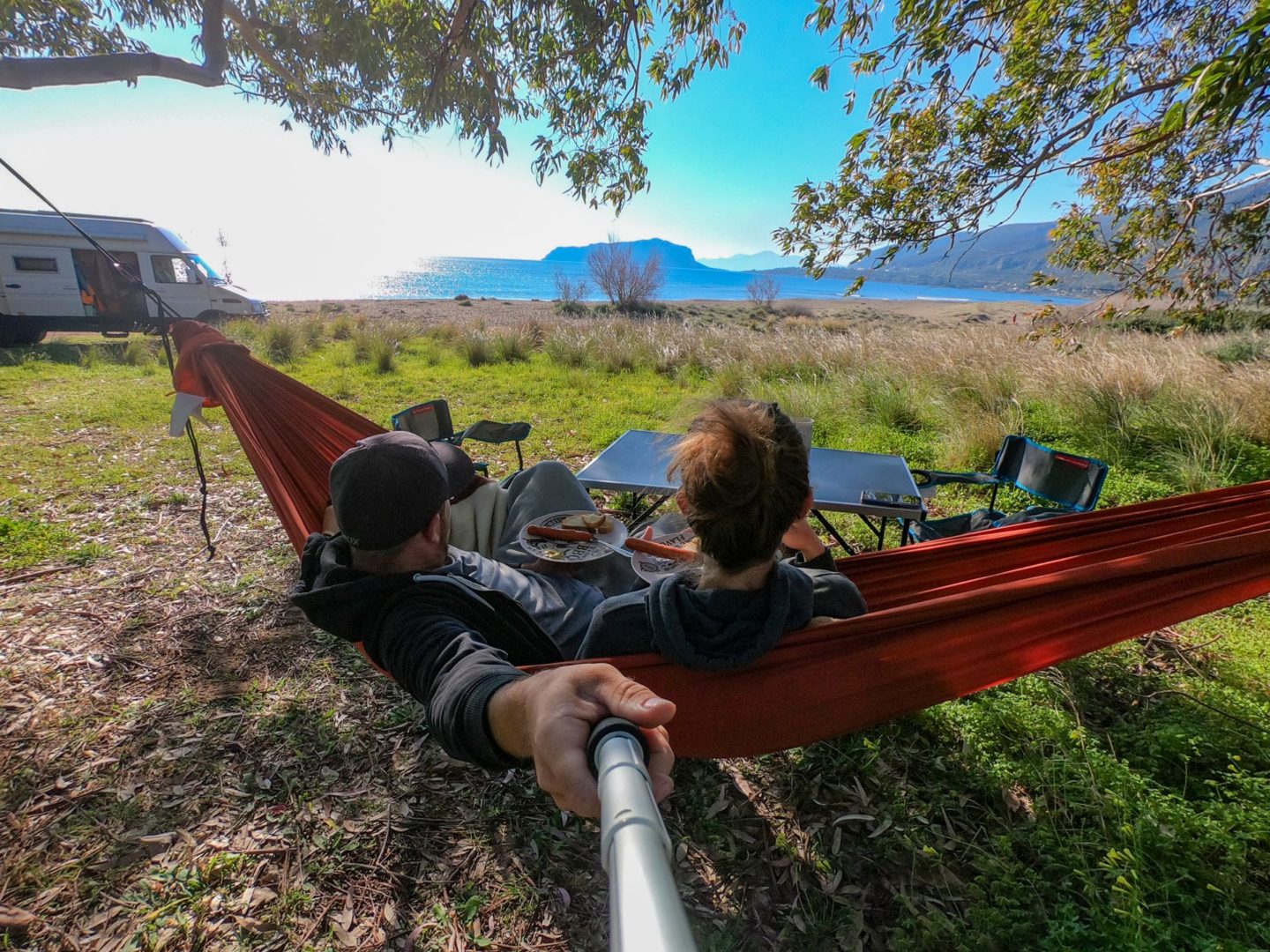 Skončili jsme na pláži blízko poloostrova Monemvasia, kterému se přezdívá řecký Gibraltar. A tam nám zase začalo léto. Celý následující den jsme trávili venku. Já jsem zase vytáhla pračku a přes den nám i všechno hezky uschlo. Leův venkovní homeoffice byl tentokrát v hamace.