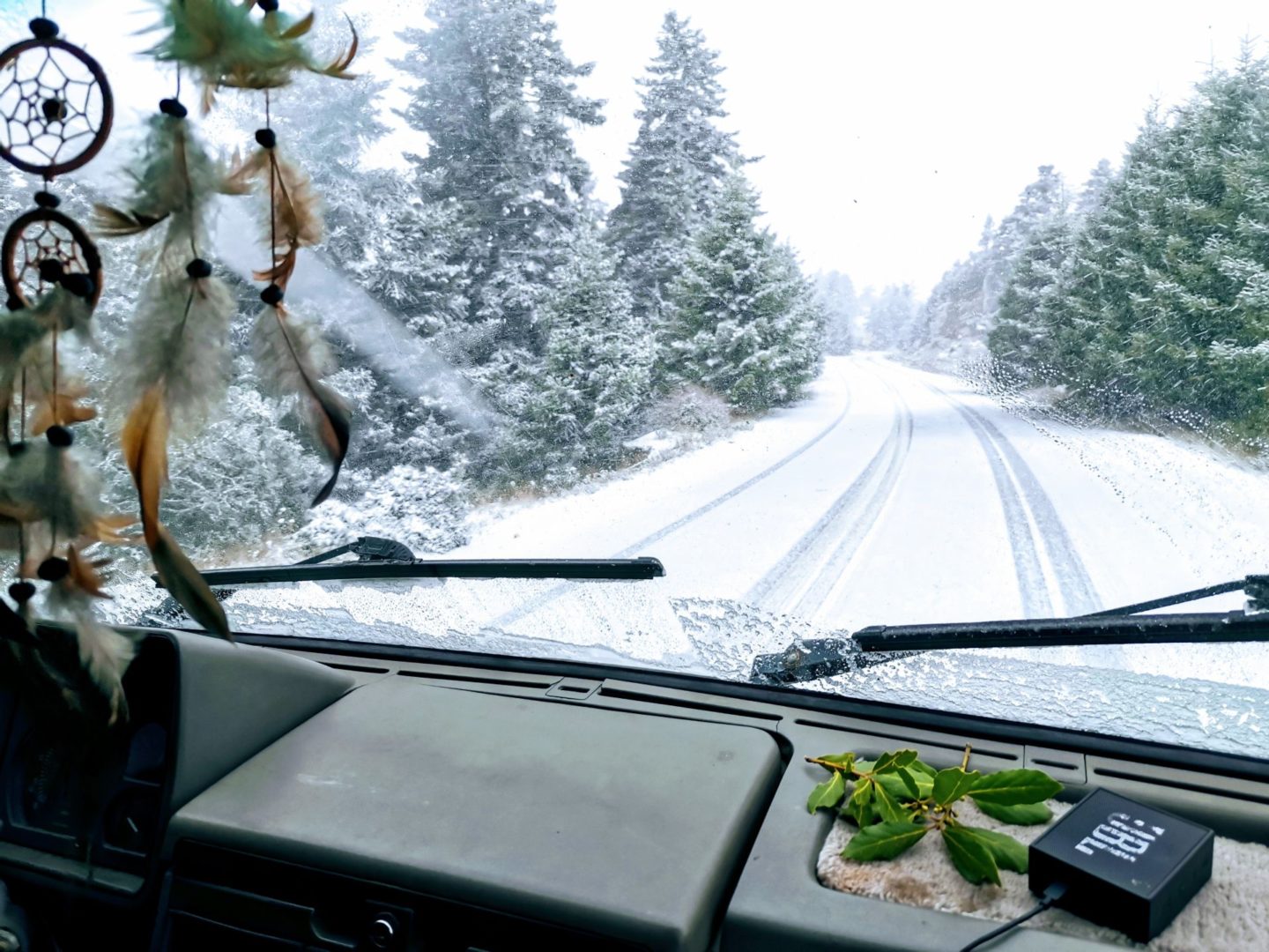 Sněžit přestalo někdy během noci a ráno nás přivítaly krásné dva centimetry tajícího sněhu. Chtěli jsme chvíli počkat, až nám slunce trochu ohřeje motor a skočili si na snídaní do místní kavárny. Měli sice jen toast, ale i to bodlo. Po tom, co Leo ometl soláry a konečně nám to začalo dobíjet, se nám i povedlo nastartovat a my po už téměř suché silnici (ráno vyjela i řecká verze rolby - pickup s radlicí) pomalu sjížděli do údolí.